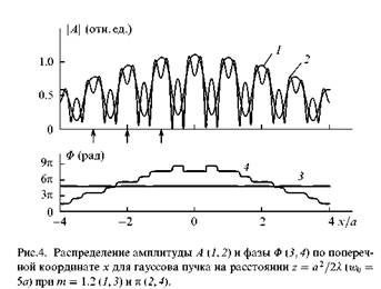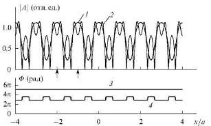 Распределение амплитуды А (1,2) и фазы Ф (3,4) по поперечной координате х для